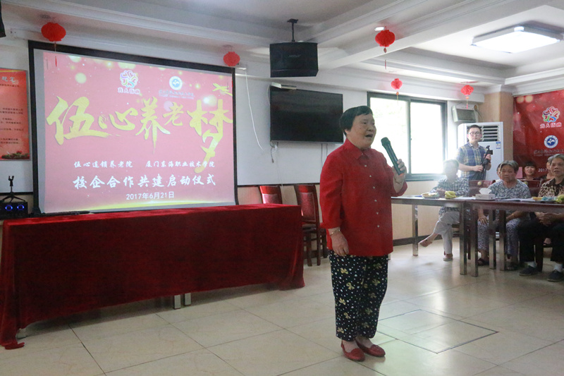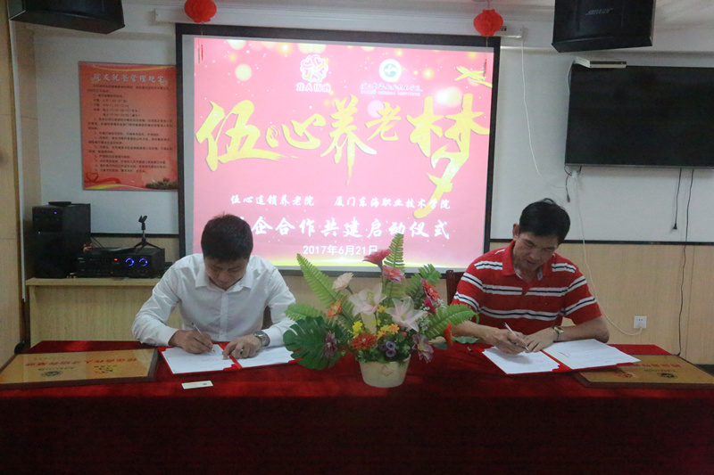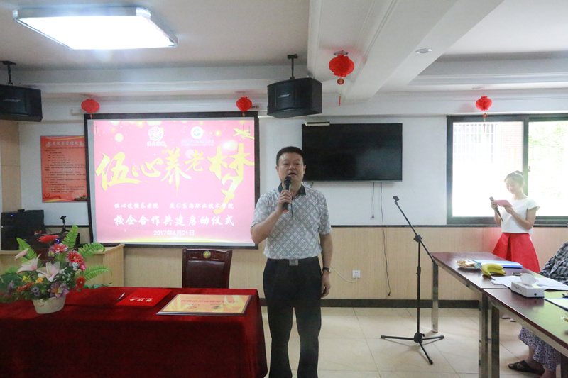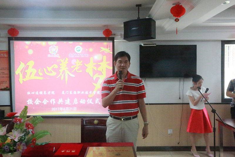 经过双方多次友好协商与精心准备,“伍心逐梦”校企合作共建启动仪式于2017年6月21日在伍心养老院厦门温馨家园总院举行。厦门市民政局副局长李龙、伍心养老院董事长陈柳树、伍心养老院总指导老师洪英、威尼斯87978797校长朱国辉、威尼斯87978797副校长杨芝萍、伍心养老院员工、伍心养老院院友、威尼斯87978797老年服务与管理专业的师生出席启动仪式。