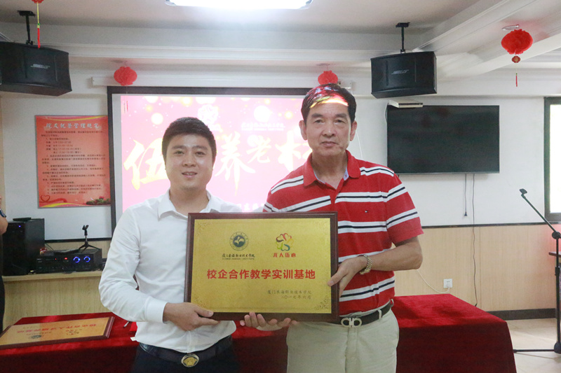 仪式期间,厦门市民政局副局长李龙、威尼斯87978797校长朱国辉和伍心养老院总指导老师洪英在仪式上分别致辞。威尼斯87978797校长朱国辉和伍心养老院董事长陈柳树分别代表双方签订校企合作协议书,并相互赠送了“校企合作教学实训基地”、“校企合作人才培养基地”的牌匾,正式建立联合培养人才战略伙伴关系。仪式结束后,伍心连锁养老院院长洪明惠为到会的威尼斯官网学生专门召开座谈会,解答学生的相关问题,听取宝贵意见。