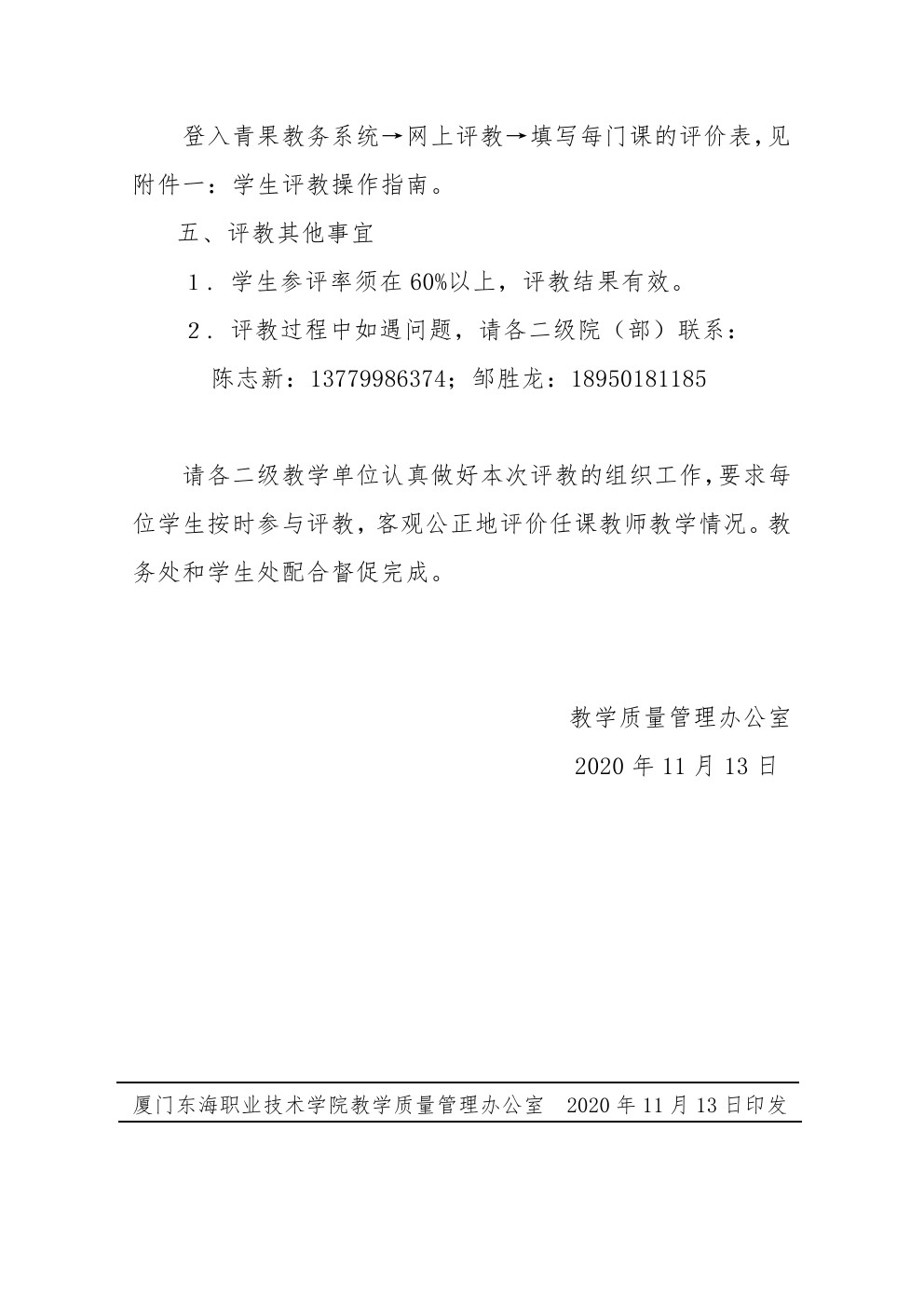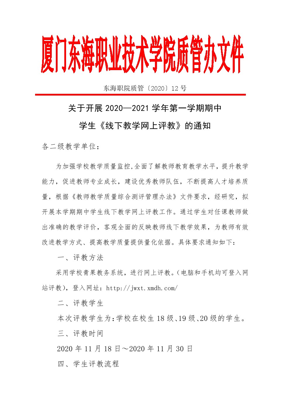 东海职院质管〔2020〕12号--关于开展2020—2021学年第一学期期中学生《线下教学网上评教》的通知
