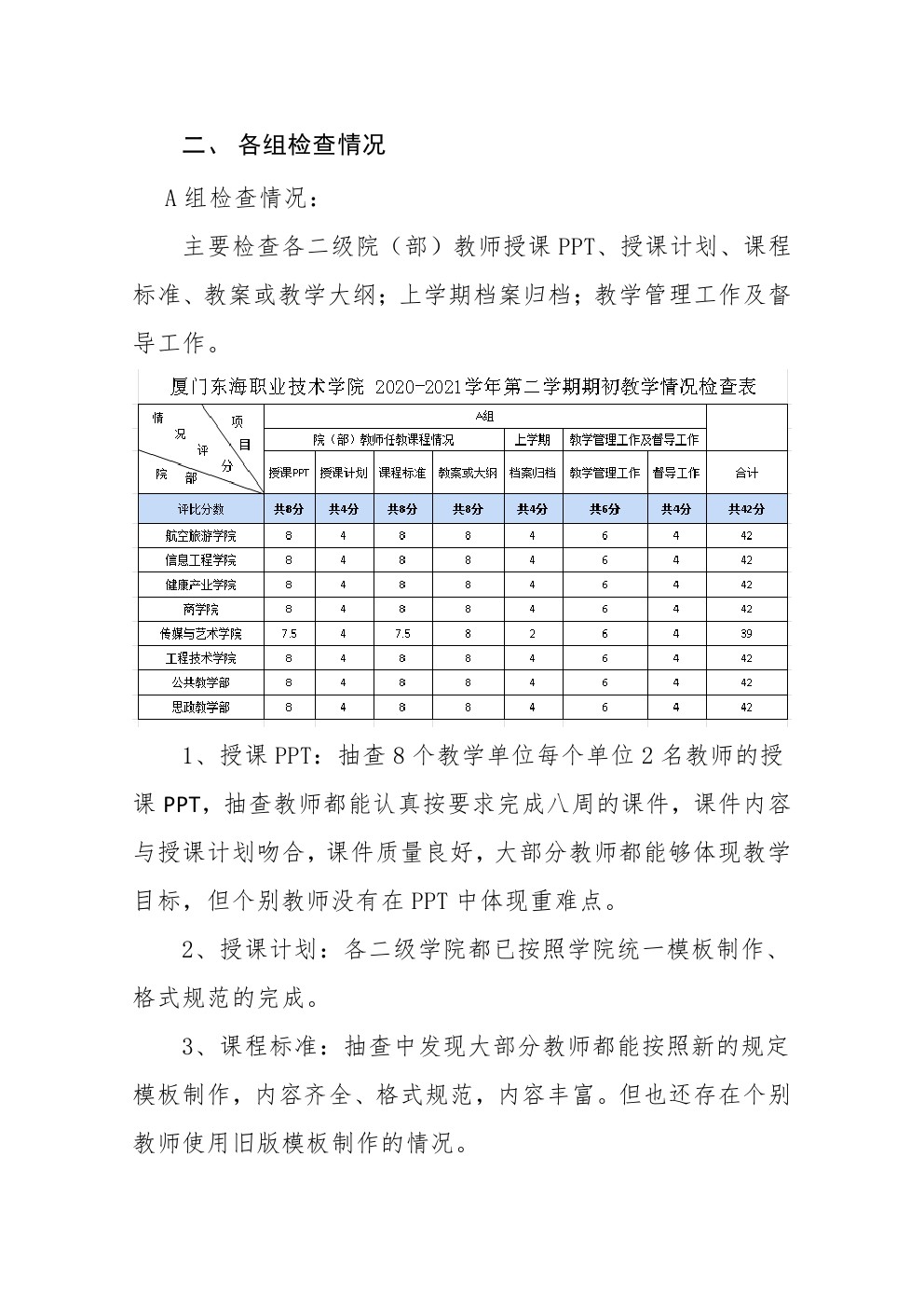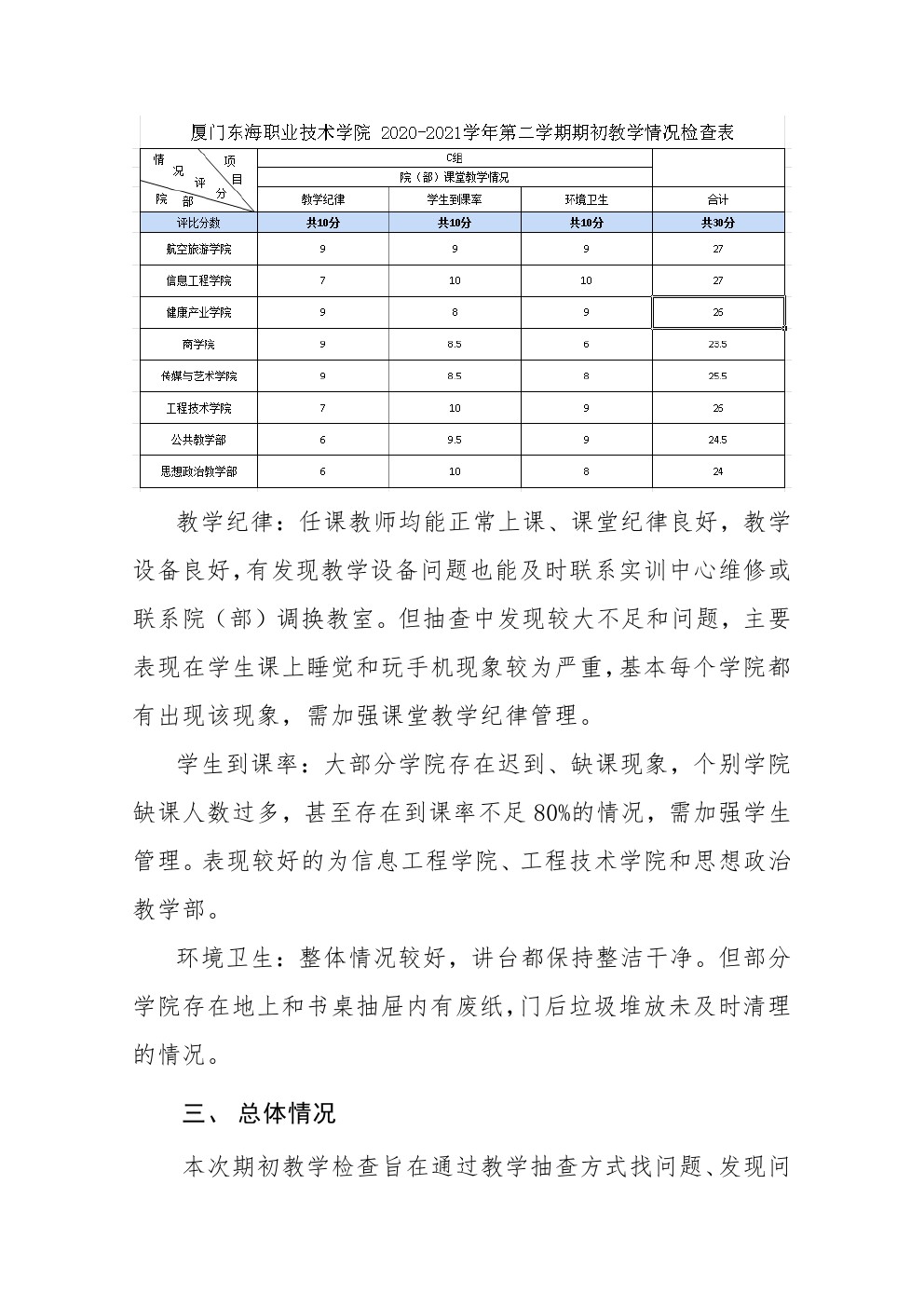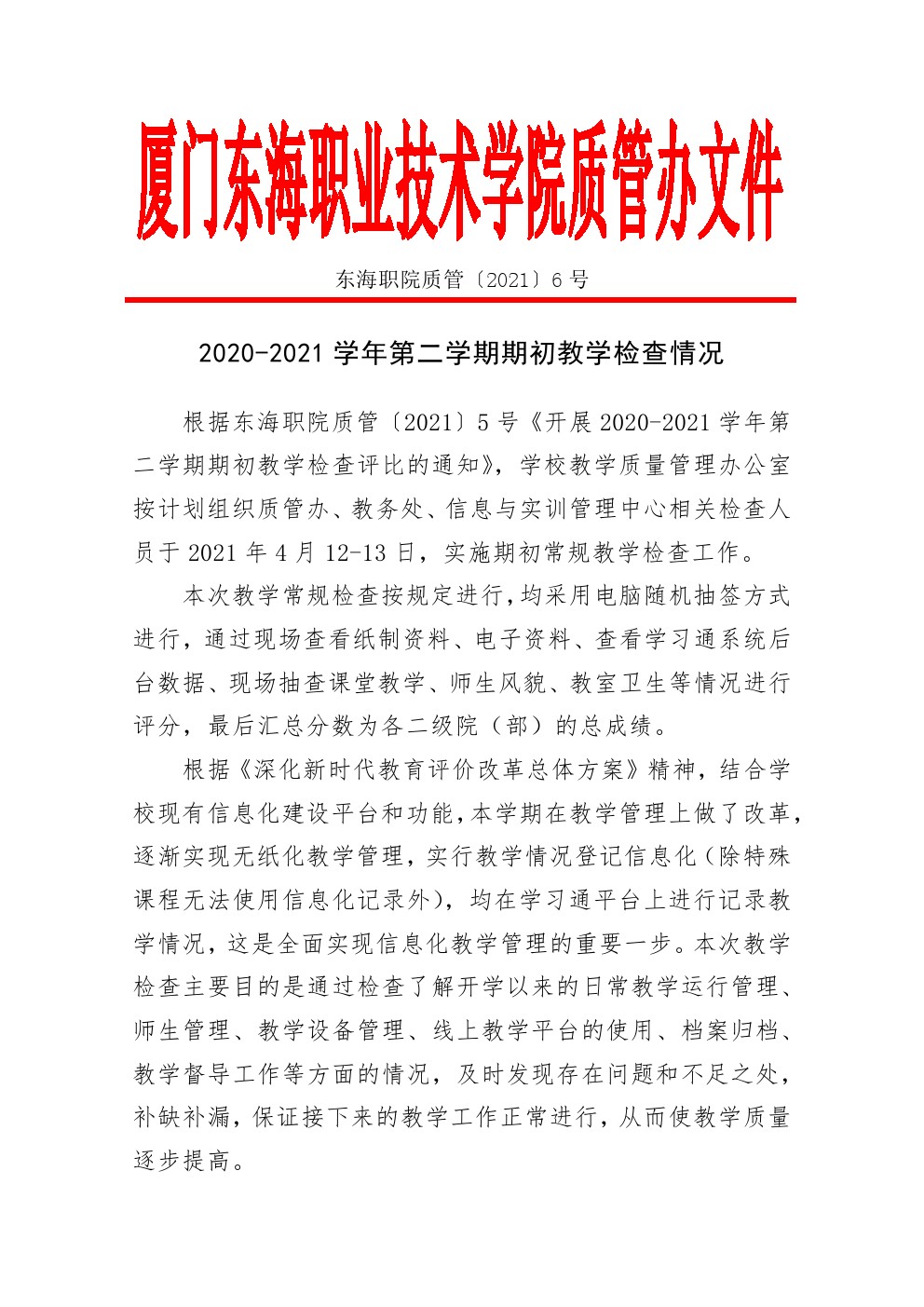 东海职院质管〔2021〕6号 2020-2021学年第二学期期初教学检查情况