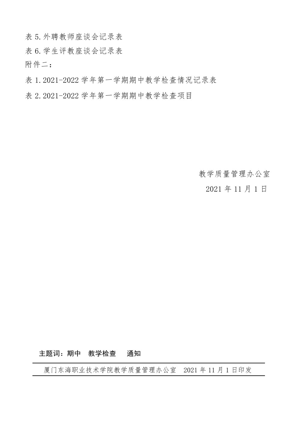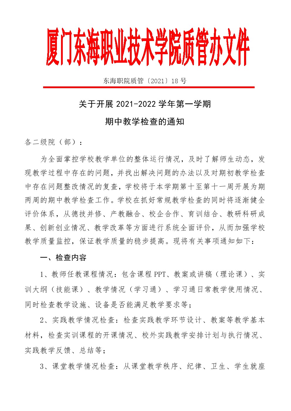 东海职院质管〔2021〕18号 开展2021-2022学年一学期期中教学检查的通知