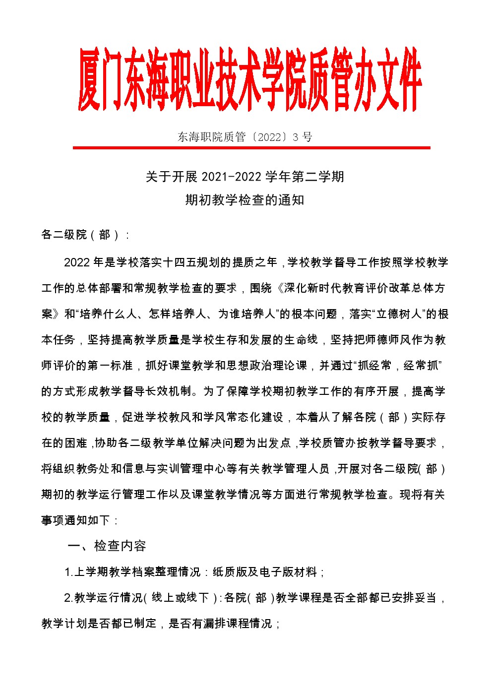 东海职院质管〔2022〕3号 开展2021-2022学年第二学期期初教学检查的通知